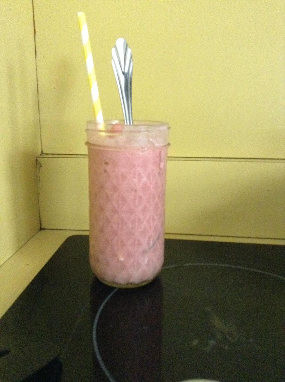 Put all ingredients in a blender except ice. Blend for a couple of minutes and then add ice . after adding the ice blend for another couple of minutes . And your done . Enjoy !Finished product