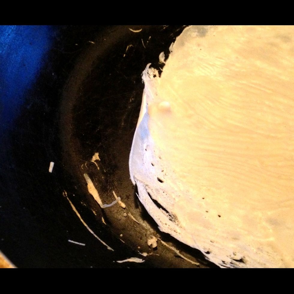 When the edges start to lift, and you don't see any wet batter spots in the middle - it's done! Lift out with a spatula & place on a plate. Keep covered with a damp towel while you make the rest.