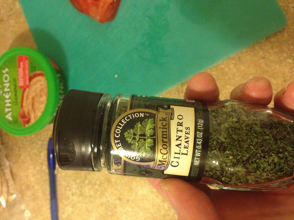 Totals: tomato 22, 1/2 cup cucumber 8, sandwich roll 100, mozzarella 70, cilantro 0, green tea 0, 1T hummus 30, tropical fruit 60 Total cals: 290