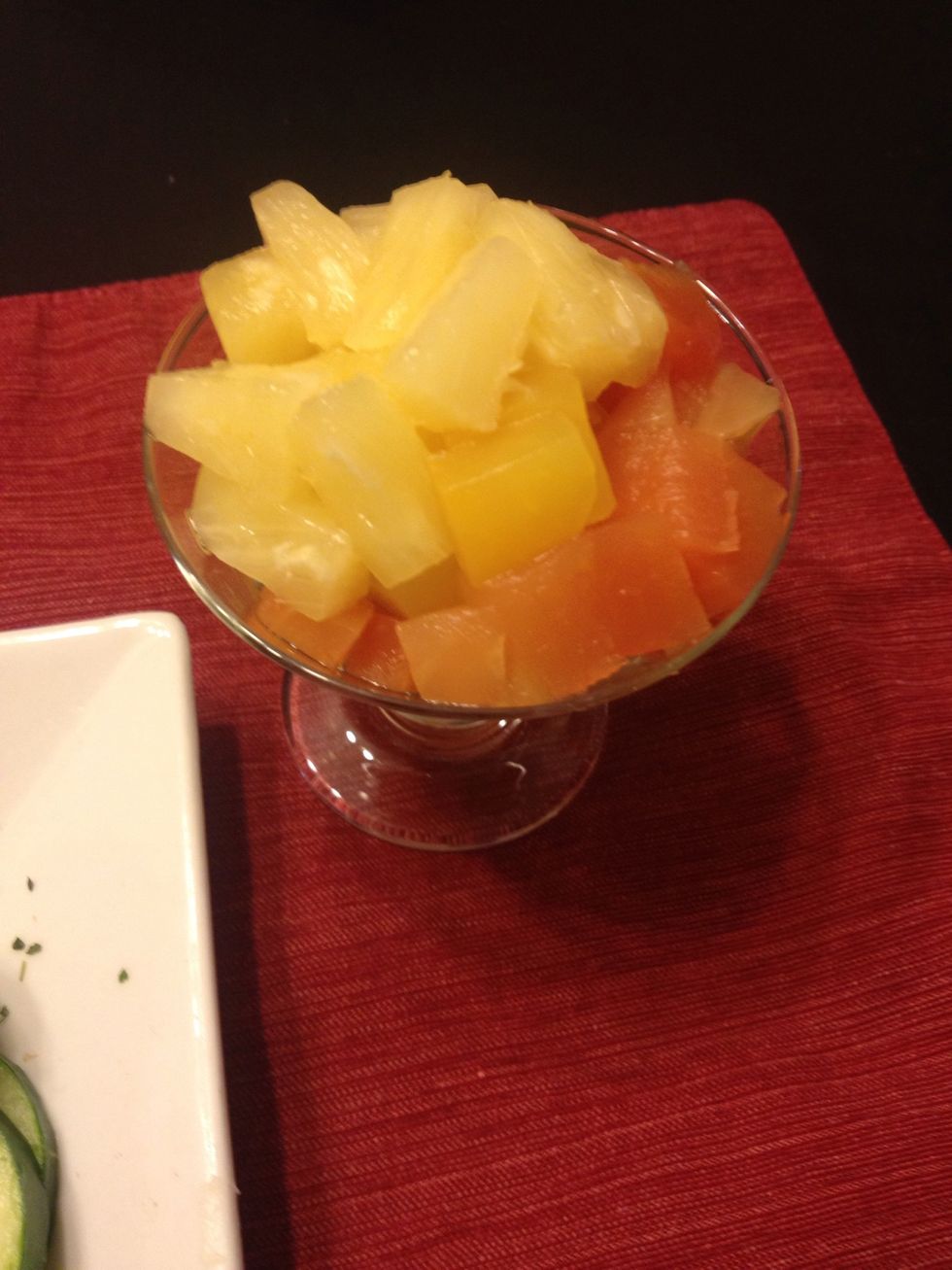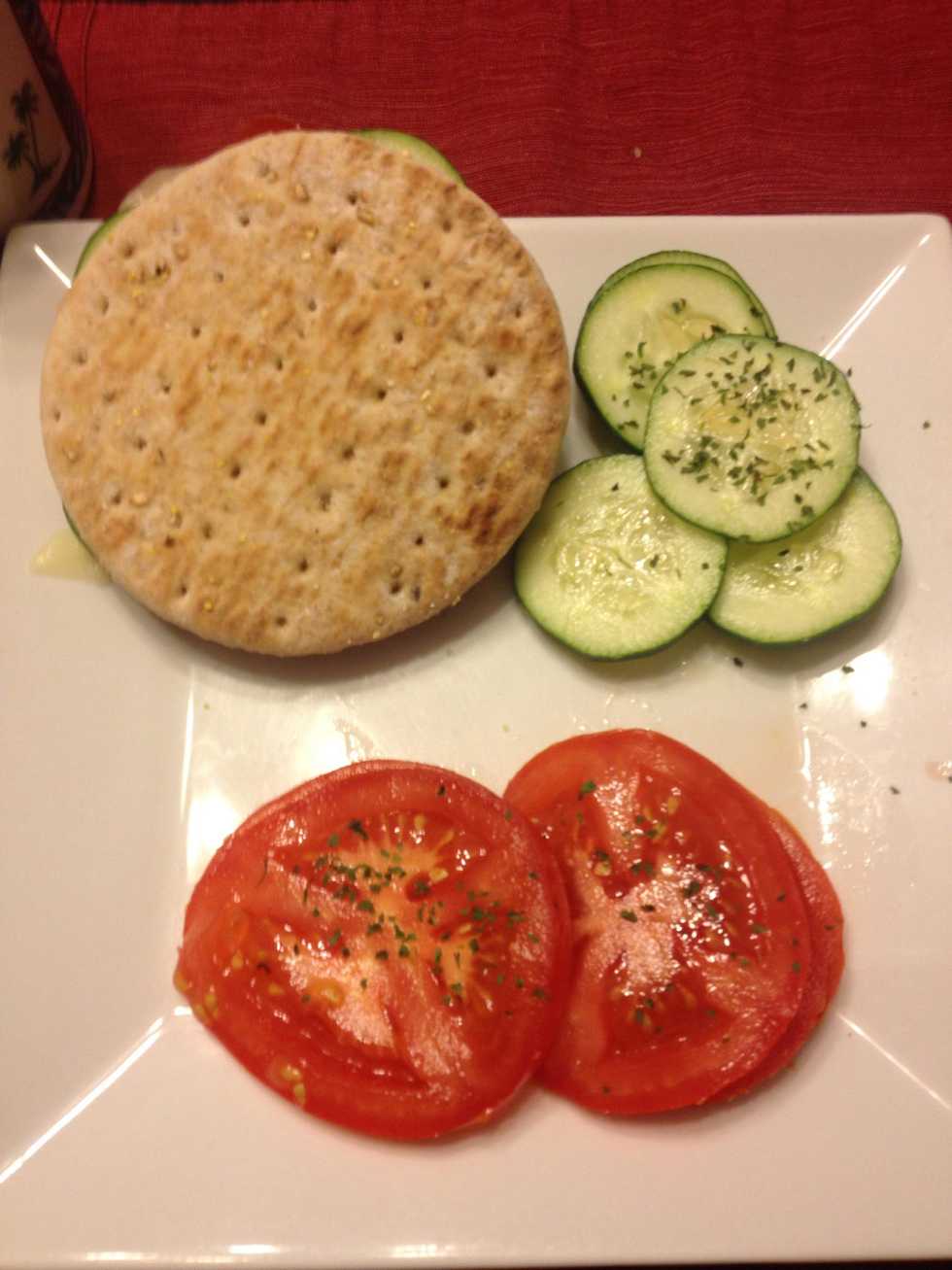 Add extra tomato and cucumbers to plate, grab some green tea and mixed fruit