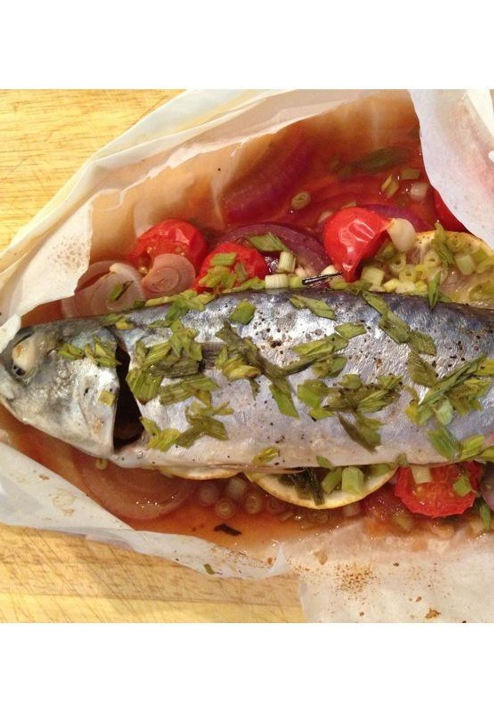 Once the Mackerel is done, cool for 5 minutes. Then cut open the parchment paper.