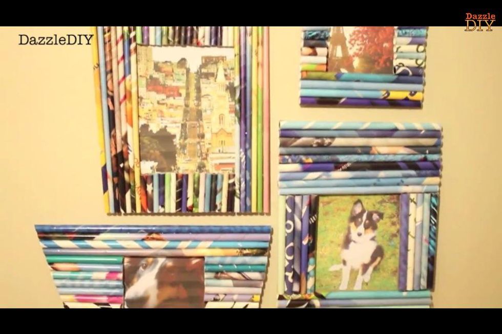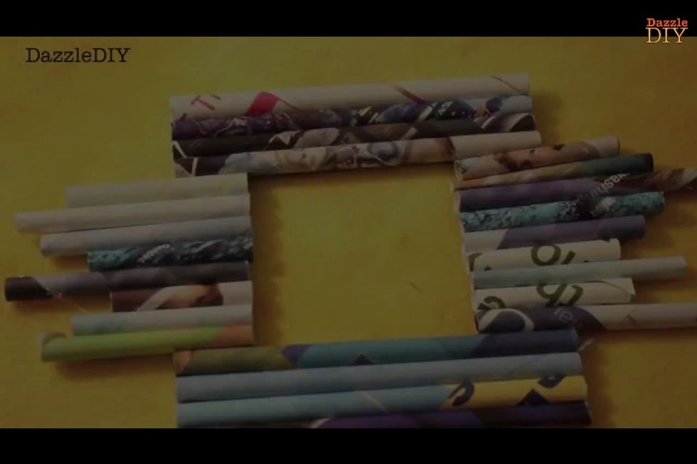 Hot glue the magazine rolls onto the farme in any pattern you want
