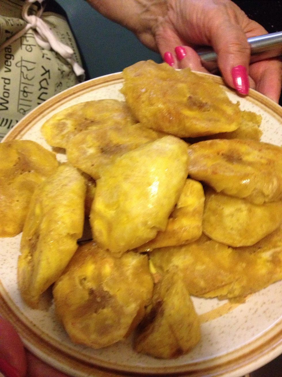 Re-fry your flattened, seasoned plátano chunks on medium- high heat. Fry until golden but do not burn!
