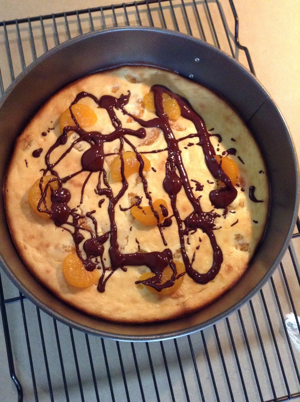 While chocolate is melting put the Mandarin oranges on the cheese cake
