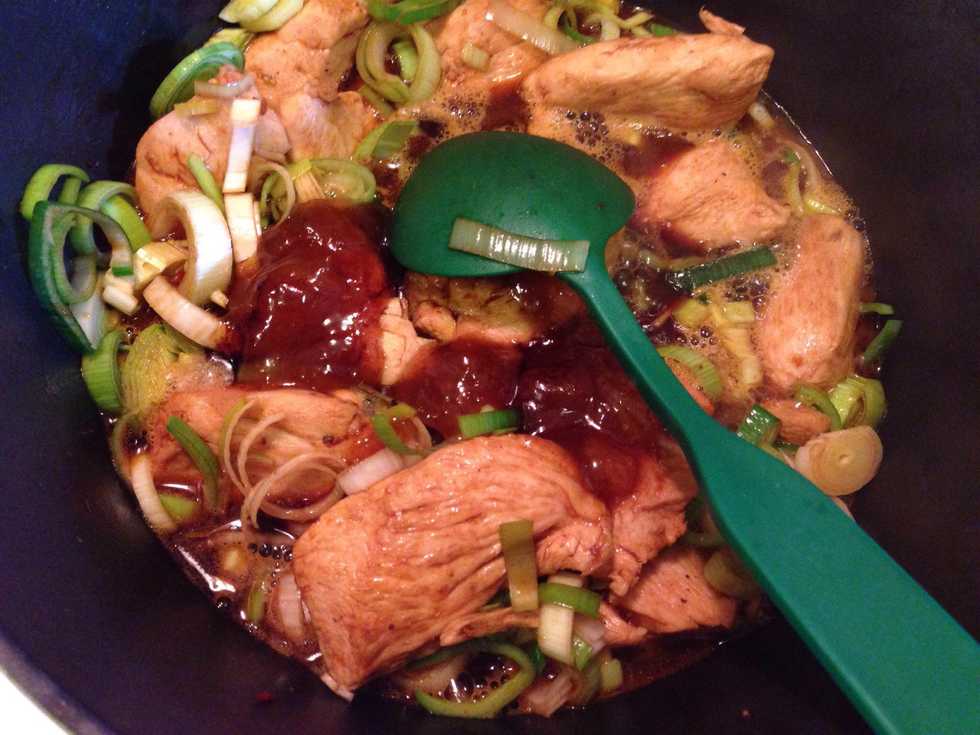Move the chicken pieces to a pot and add sambal oelek (or chopped chili fruit).