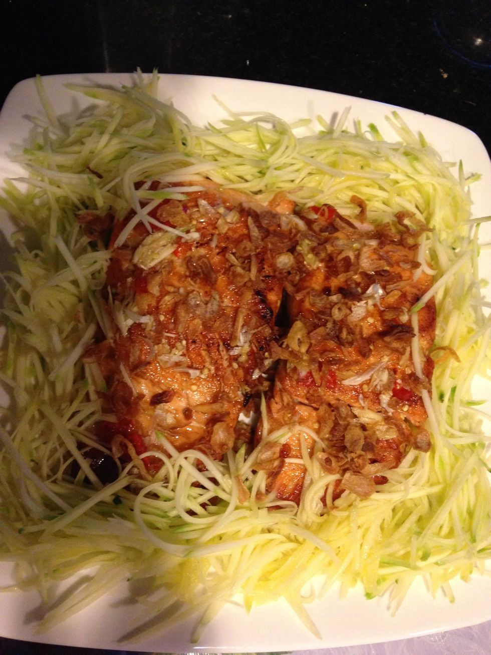 To make the sauce: Add the smashed up garlic and red pepper into fish sauce and sugar