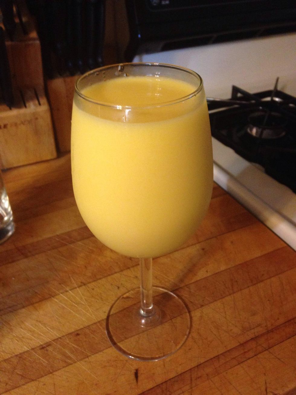 First I added all of the frozen fruits into the blender then I added the orange juice and wine . I used a nurtibullet for a quick and easy blend with great consistency .My version of an Adult smoothie!!! Enjoy!!
