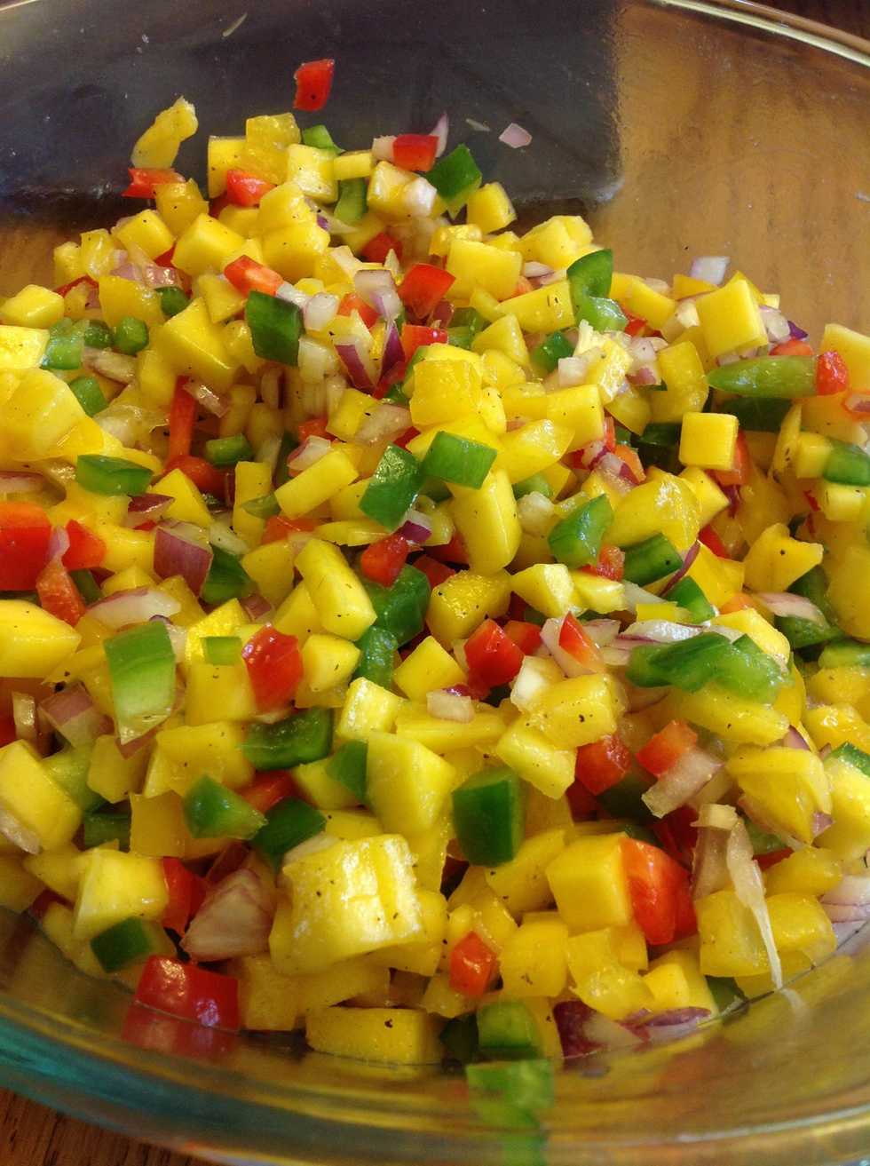 1.0 Red pepper1.0 Green pepper1.0 Yellow pepper1.0 Red onion2.0Tbsp Red wine vinegar 1/2tsp Salt2.0 Mangos Red wine vinegar Salt Pepper Olive oil