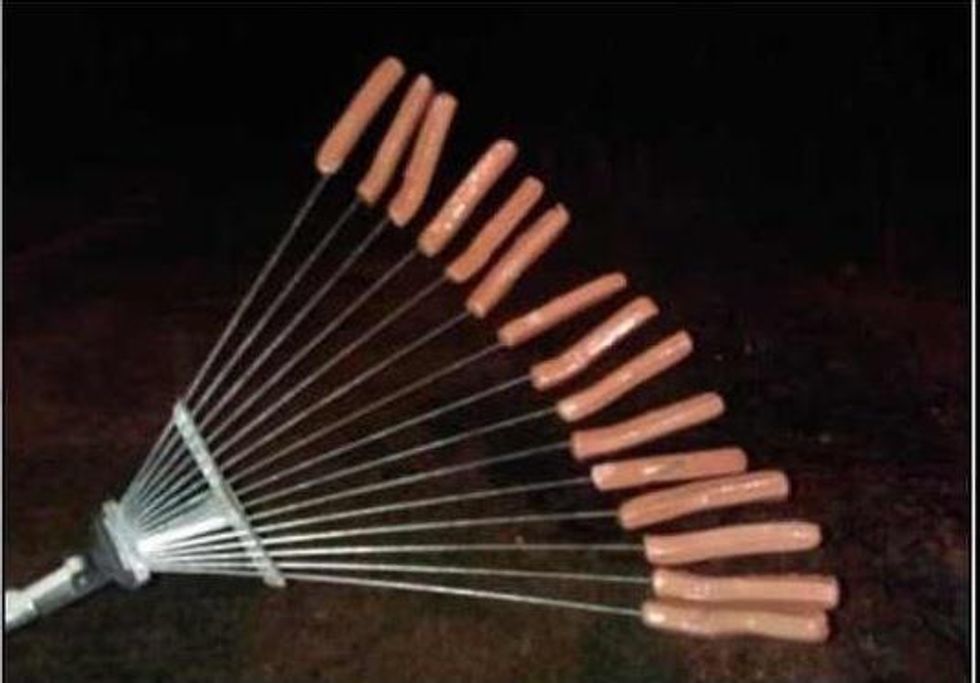 Got a big family? Take forever to cook all those hotdogs on a camping trip? Not anymore! Put the hot dogs on a rake like this. Cook over fire to desired doneness.