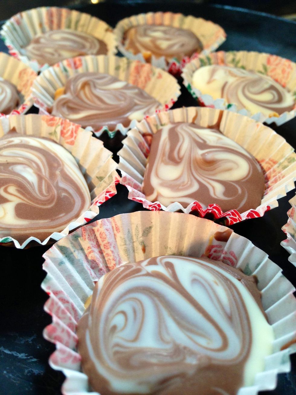 Once the cups are cool again pour some of the left over milk chocolate on top and then pour a small amount of white chocolate on top of that