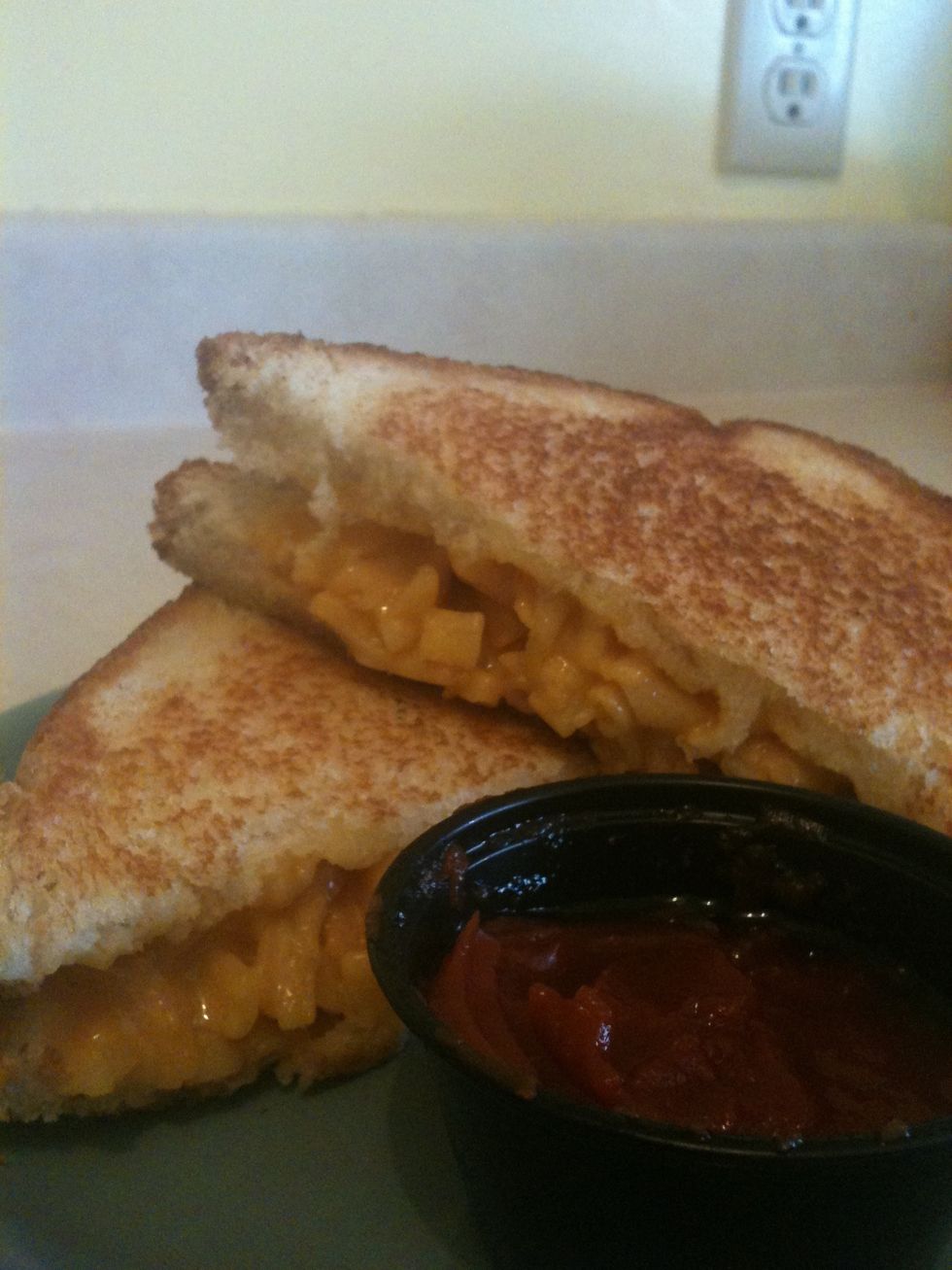 I like to add ketchup to the Mac and cheese sauce, you don't have to if you don't want to. Make sure it is thick so that it holds together in the sandwich.