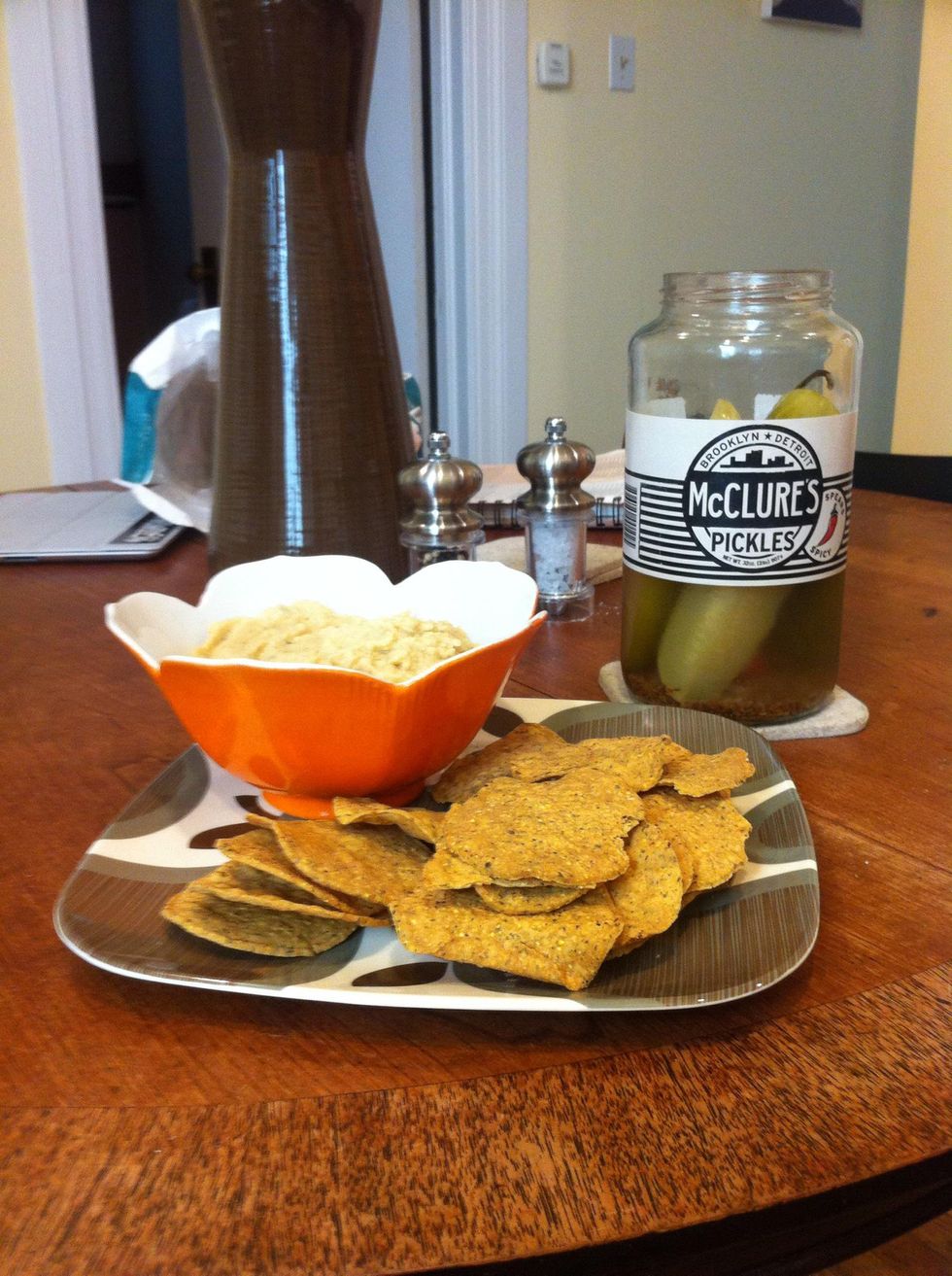 now for your garlic. I like to pull a clove or two out of the pickle brine. if you want the hummus to be extra spicy, drop a pepper in from the jar as well.