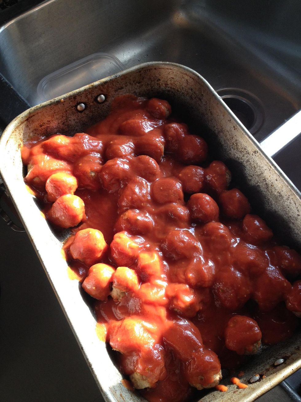 Preheat oven to 350 Place meatballs into the pan and cover with spaghetti sauce. Cook in oven for 20-30 minutes While in oven sprinkle cheese on to the bread.