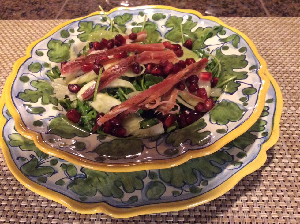 Divide the greens among plates. Top with fennel, then drape with prosciutto. Sprinkle pomegranate seeds over. Enjoy!