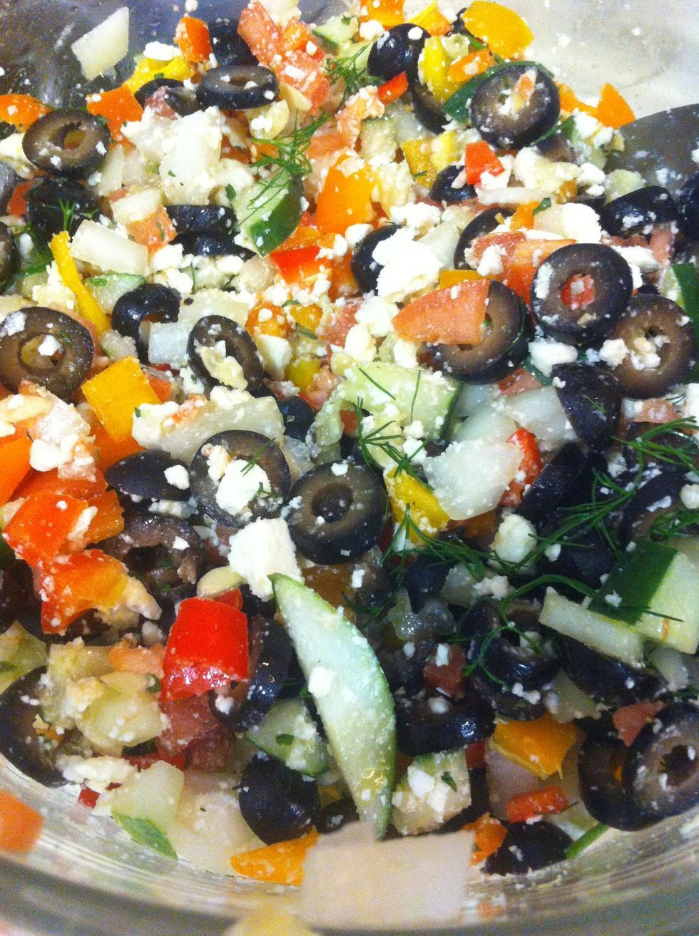 Mix into veggies - feel free to stop at this step (option#2) for a yogurt-dill veggie salad with no pasta