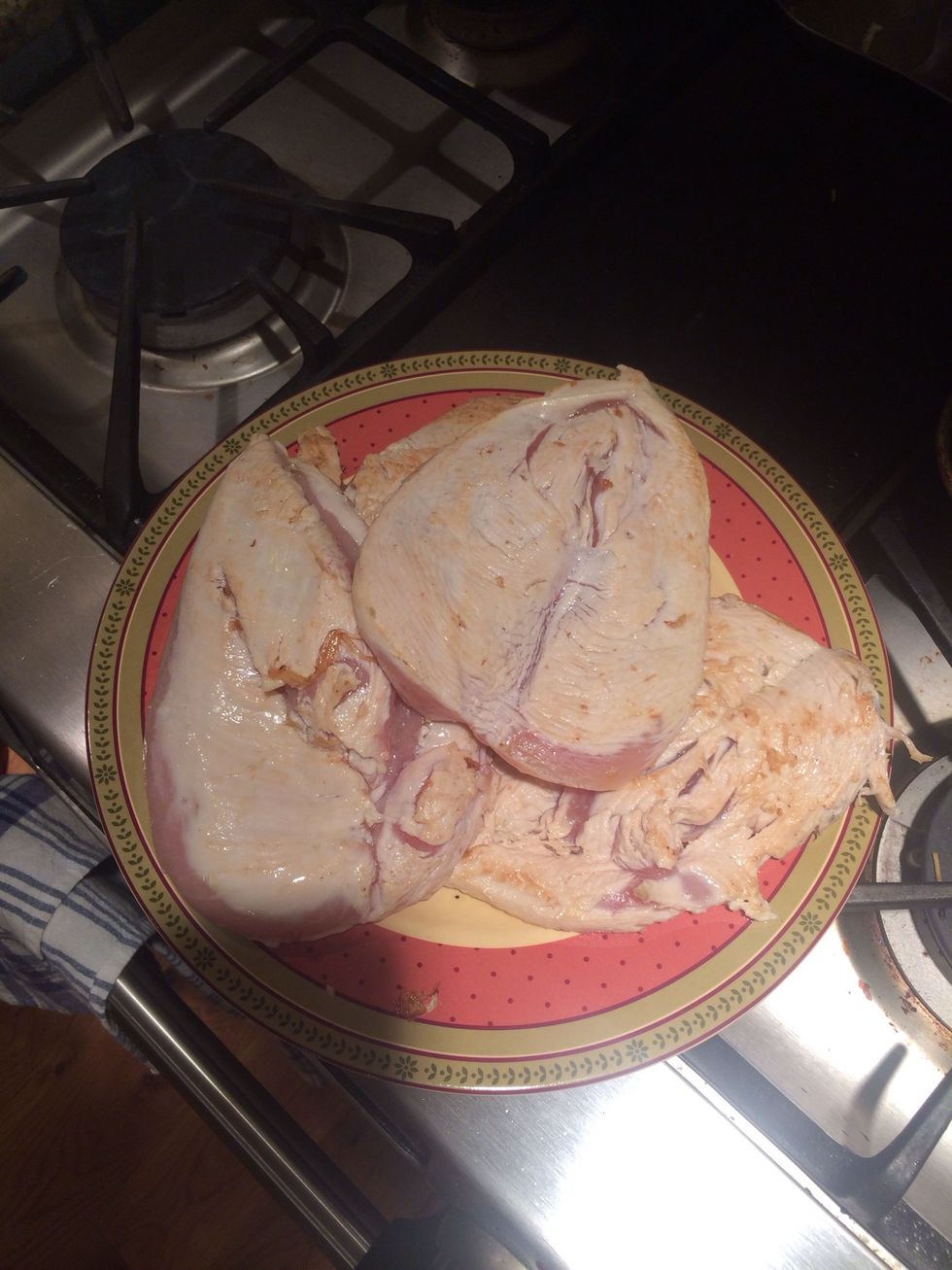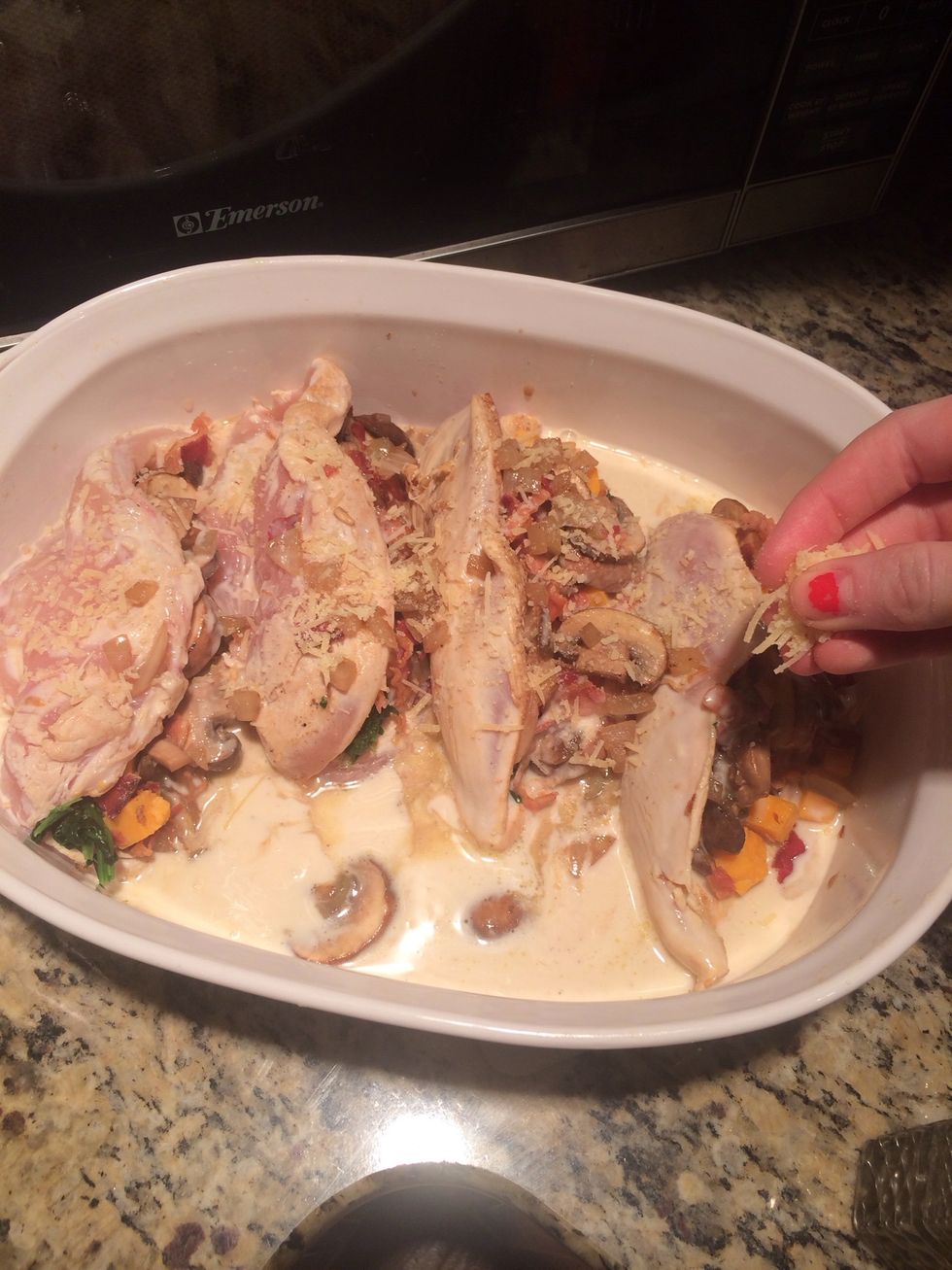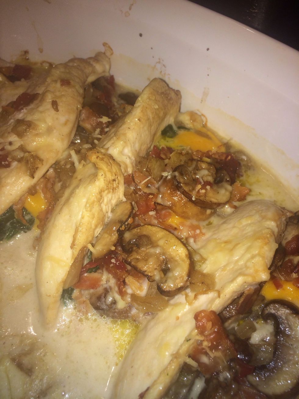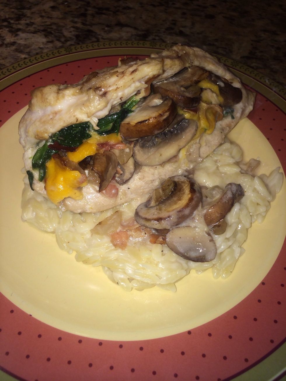 Stuff the chicken with the cheese, mushroom and onions, spinach and Bacon
