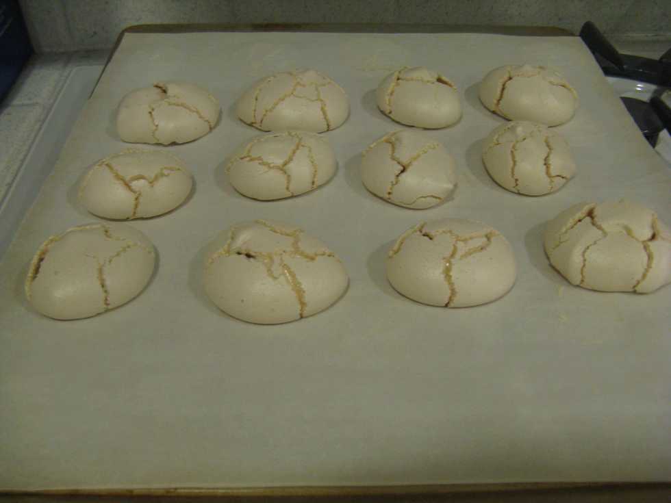 Meringues will be slightly crunchy and soft. Cracks in the meringues are normal.