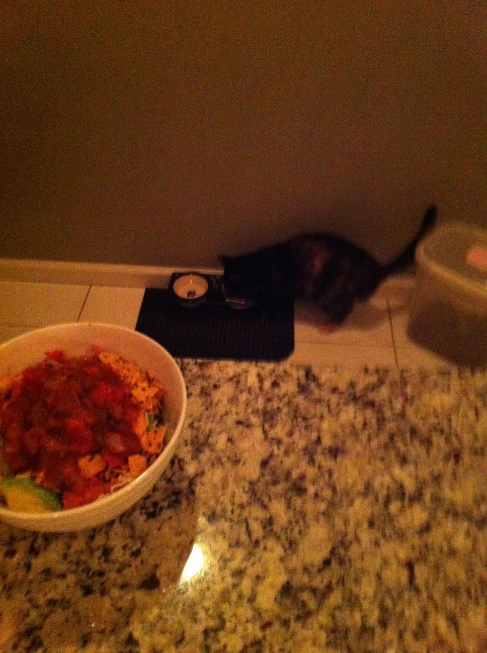 Don't forget to feed the cat too, before chowing down! Experiment with other toppings-- tabasco, sour cream, etc.
