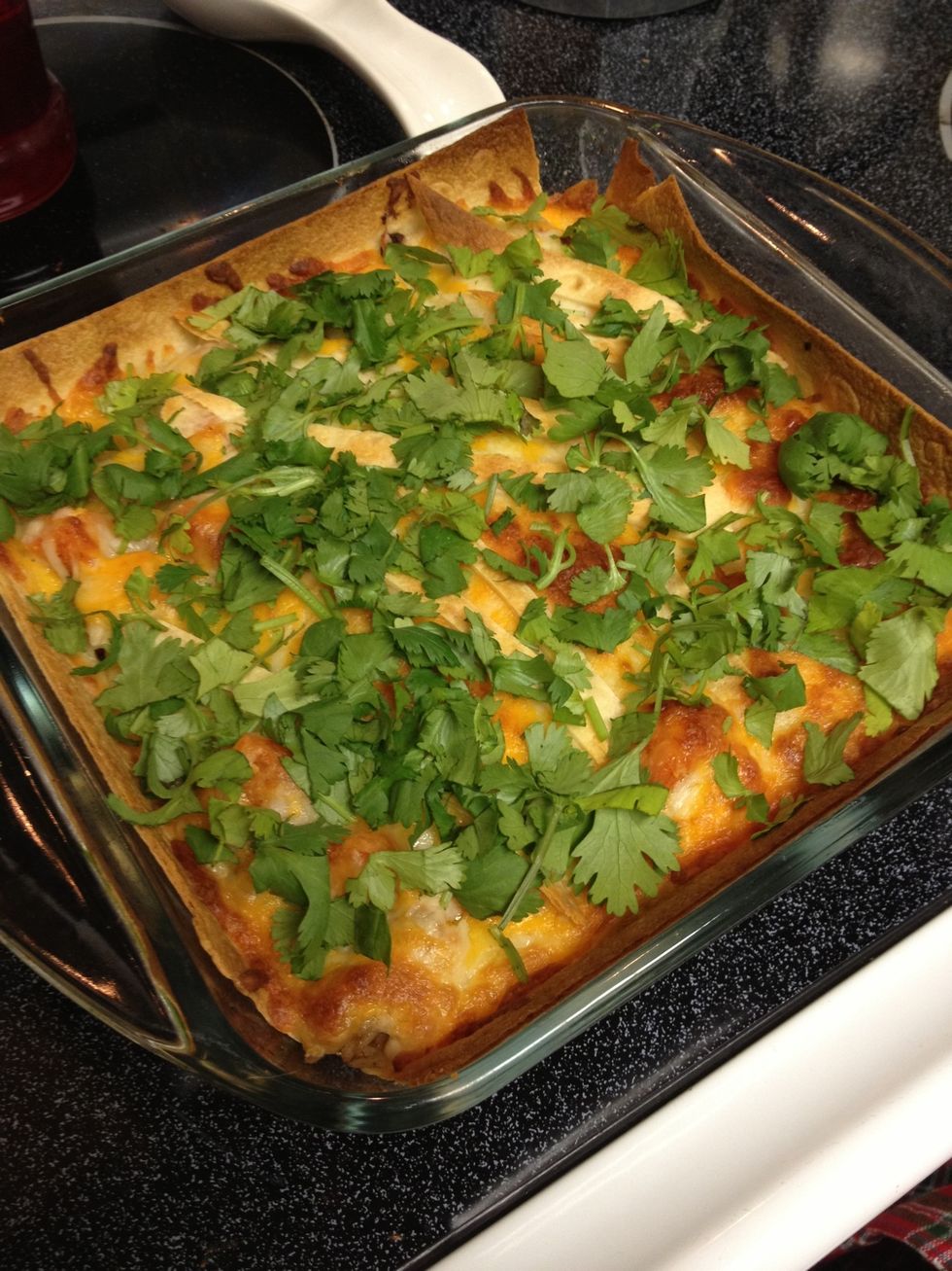Slice the remaining tortillas into strips and place on top. Bake at 300 till cheese is melted and tortillas are toasted.