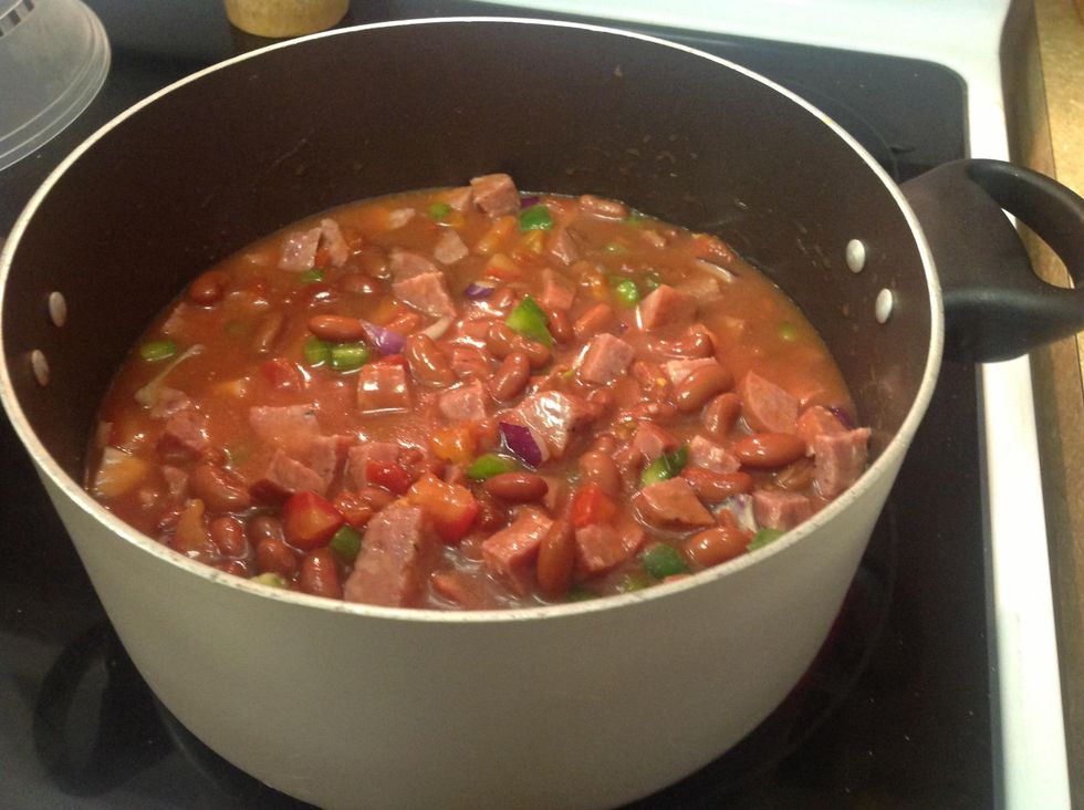 Need German sausage, beans (any pinto, navy, your choice), canned diced tomatoes & canned tomato sauce, diced fresh whole tomato, diced 1/2 whole onion & diced whole fresh green pepper.