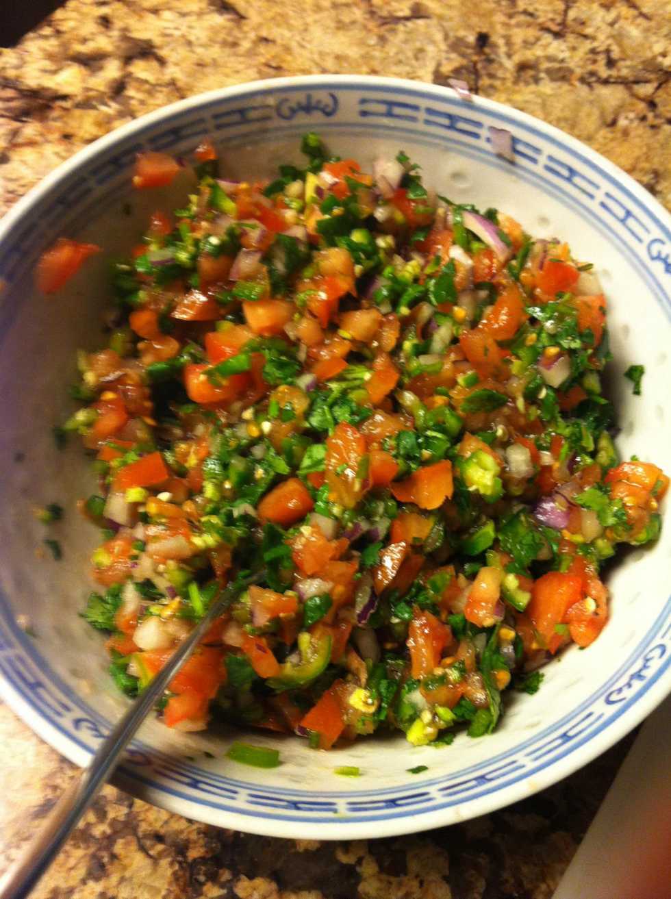 Fine chopFine chopThrow in bowlChop small pieces not too fineSalt the top, just enough to cover the topCut in half. Throw out the long stems.Throw togetherMix with a fork.