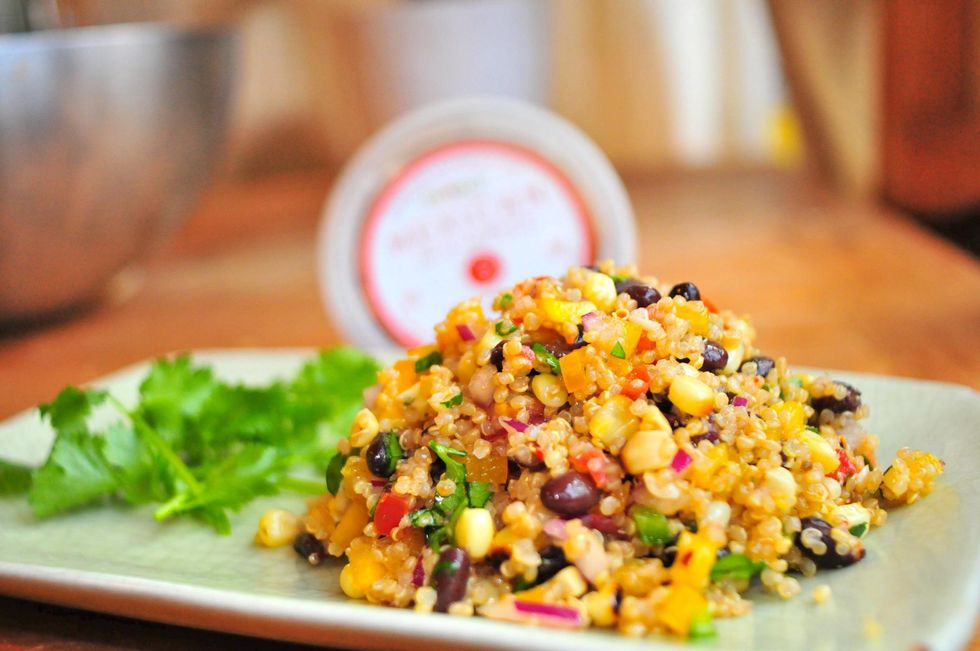 Take 1 cup quinoa, 1 tsp. Mexican in a Minute, and 2 cups water. I like to add the quinoa and seasoning to a pot over medium-high heat and toast them for a few minutes before adding the water.