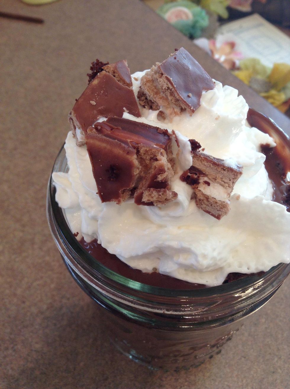 Start by putting a layer of cake into your container.And than a layer of pudding.Add your sweet treat in small pieces. (I used wagon wheels)Replete until your container is filled to the top.Enjoy!!!