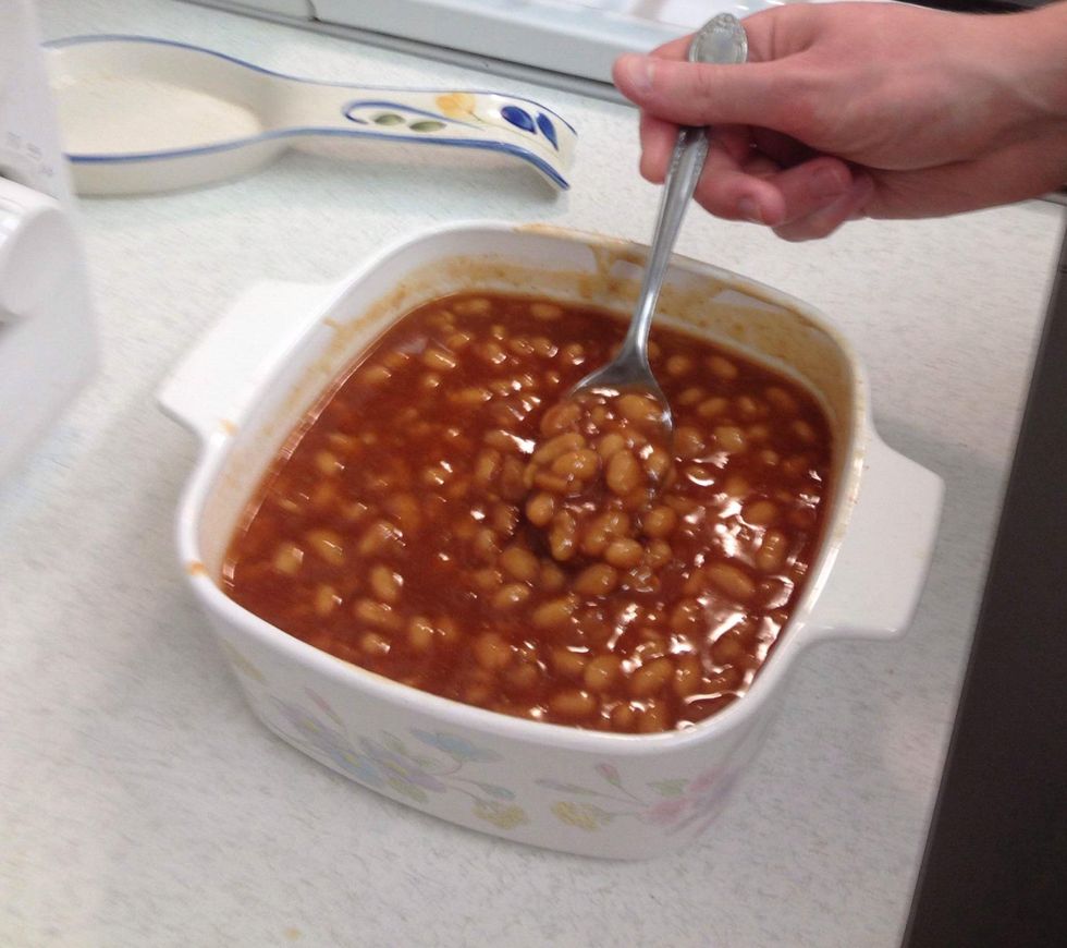 Pour the two cans of beans into the casserole dish.