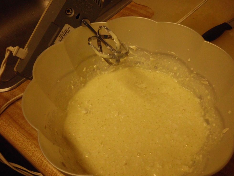 Take your cream cheese, and let it sit out to soften. Then place it in a large bowl, and add the sugar, vanilla extract, and then the eggs. Then stir with an electric mixer until well blended.