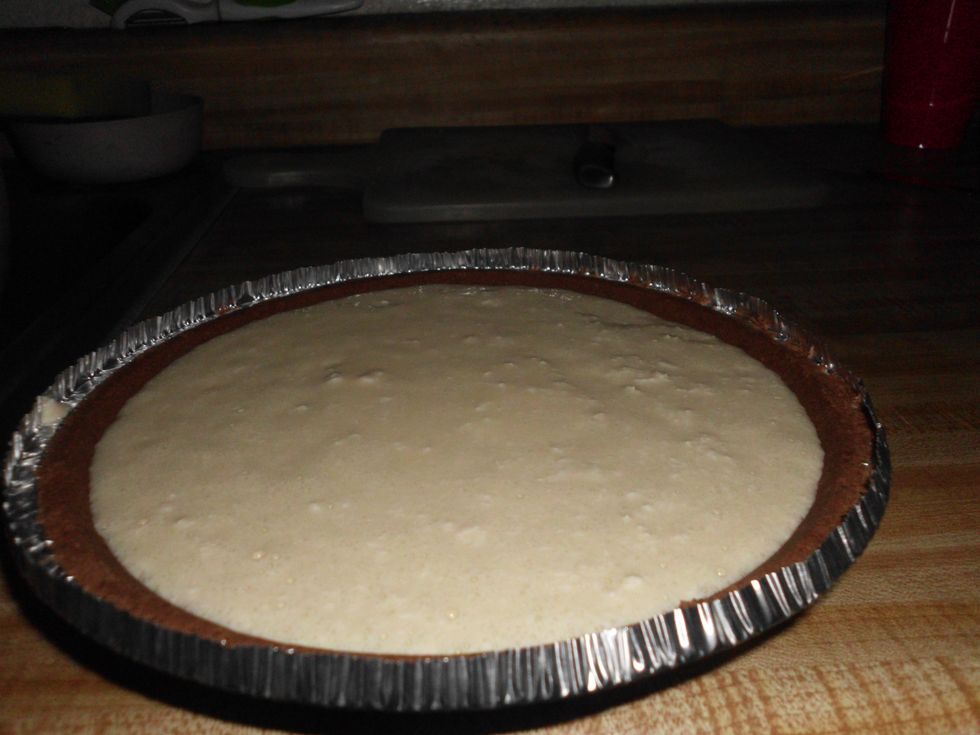 After you are done mixing it together take it, and pour the mixture into the pie crust. "please note you do not have to use the graham cracker pie crust, any pie pie crust will do just fine".