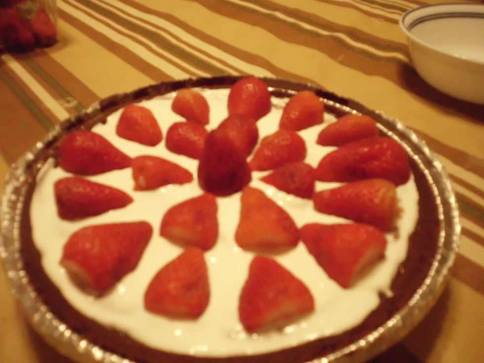 after the cheese cake is cover with sour cream, the next is to take out the strawberries, and cut the stems off, and then cut them or dice them. "Remember you don't have to have whole strawberries".