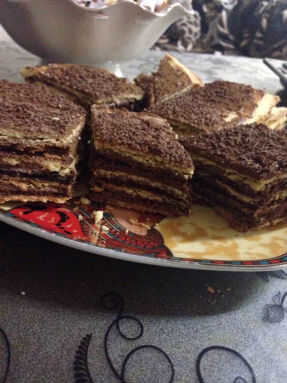 Time to assemble the cake. Put the layers on top of each other and spread the frosting between each layer