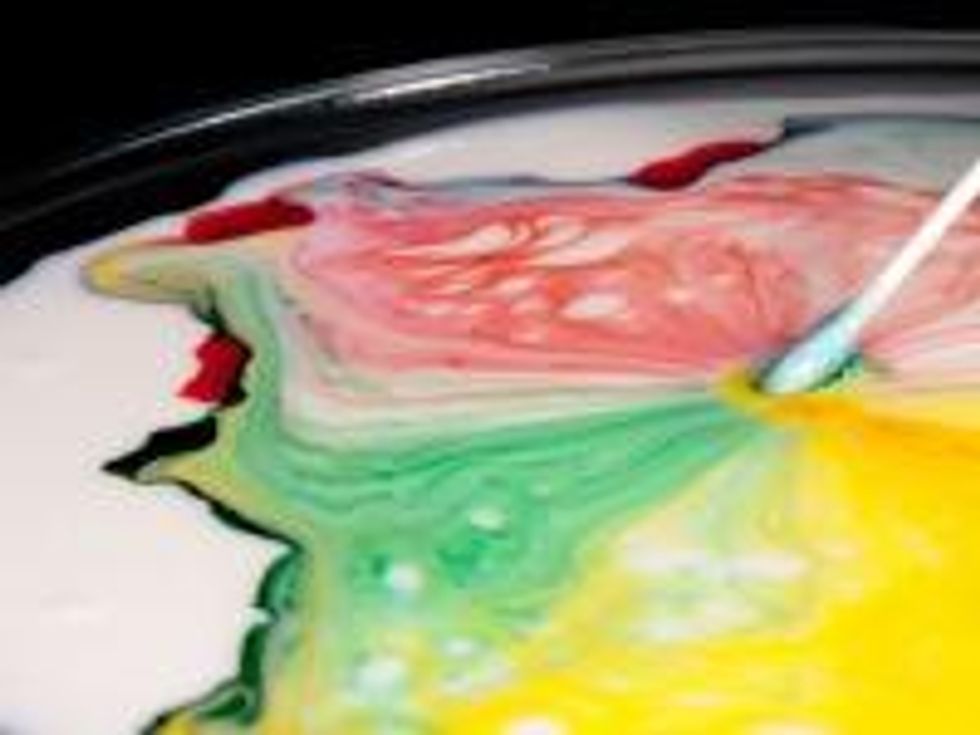Dip 1 end of the cotton swab in the dishwashing soap then place it in the middle of the milk and colouring droplets. Hold for 10-15 seconds.