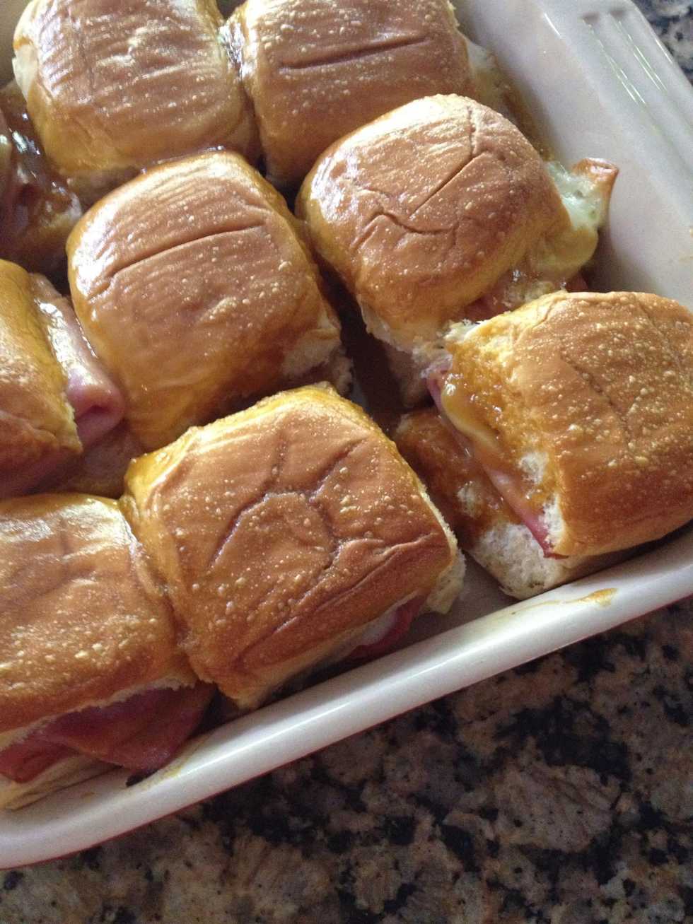 This is a great thing to do w a lot of kids. They make a little assembly line and stack sandwiches for me. Place in casserole dish. Squeeze them all in!