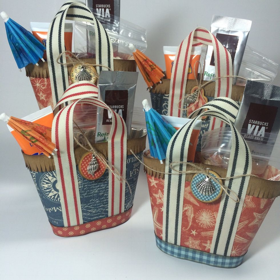 Put a few Summer themed goodies in the totes like a sunscreen, drink mix, sea shell chocolates, and a drink umbrella.