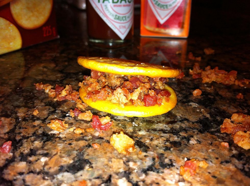 put a quite a few drops (if you like the heat) of hot sauce in the center of each cracker