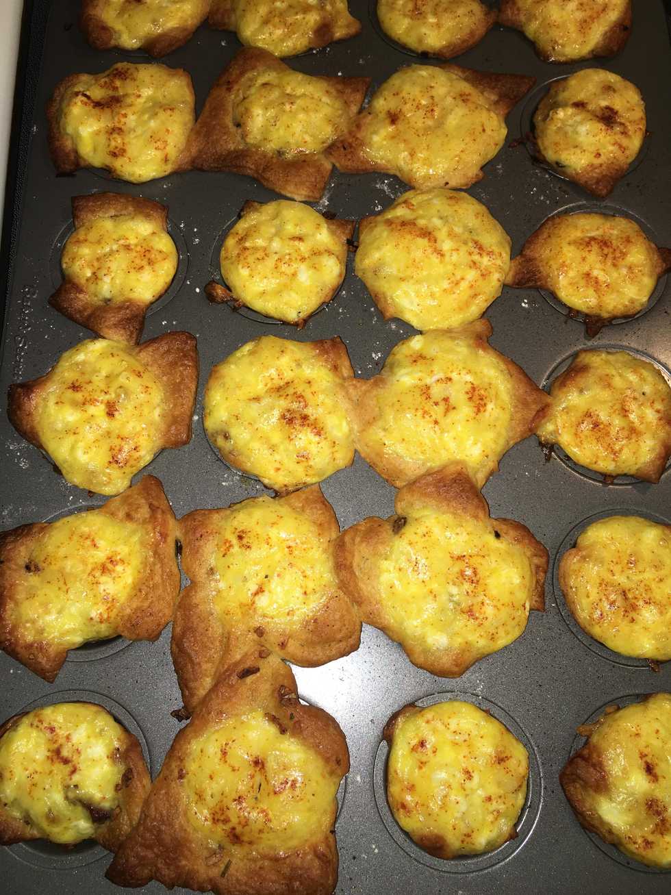 Combine eggs and cheese (all the cheese), and put 1 teaspoon over the sausage mixture.