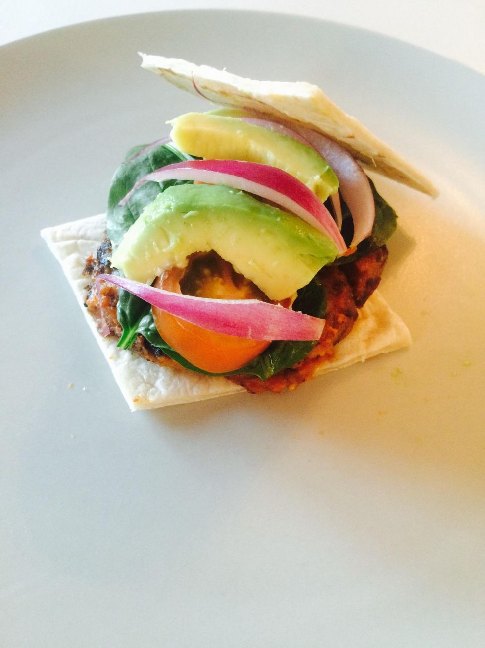 Prepare the rest of the vegetables for the burger: avocado and tomatoes. Leave it on the chopping board together with the red onion.