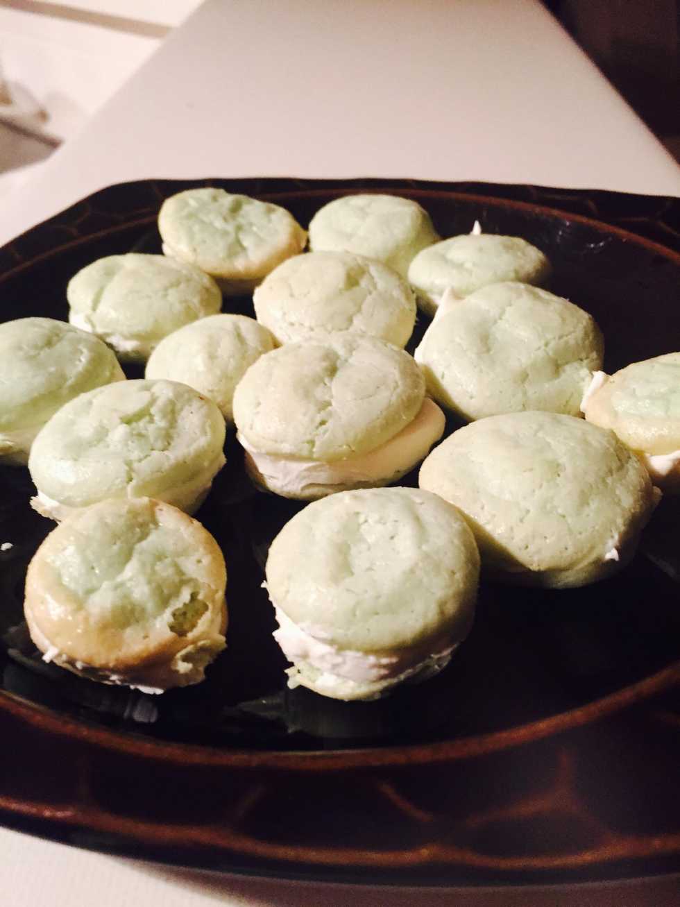 Sifted Almond Flour and Powdered Sugar.Whipped Egg Whites.Egg whites with green food coloring.Wet and Dry mixed together.How the folding should turn out.The baked macarons.White Chocolate Filling