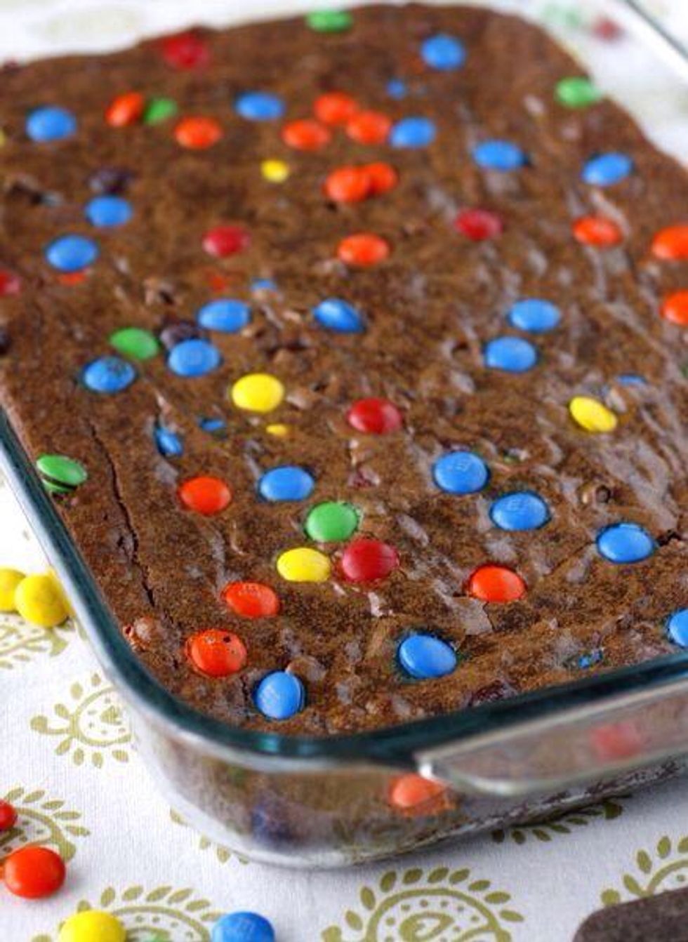 Step Four : Add wet ingredients (eggs, water, melted butter, and vanilla) and then the m&m's and stir well.