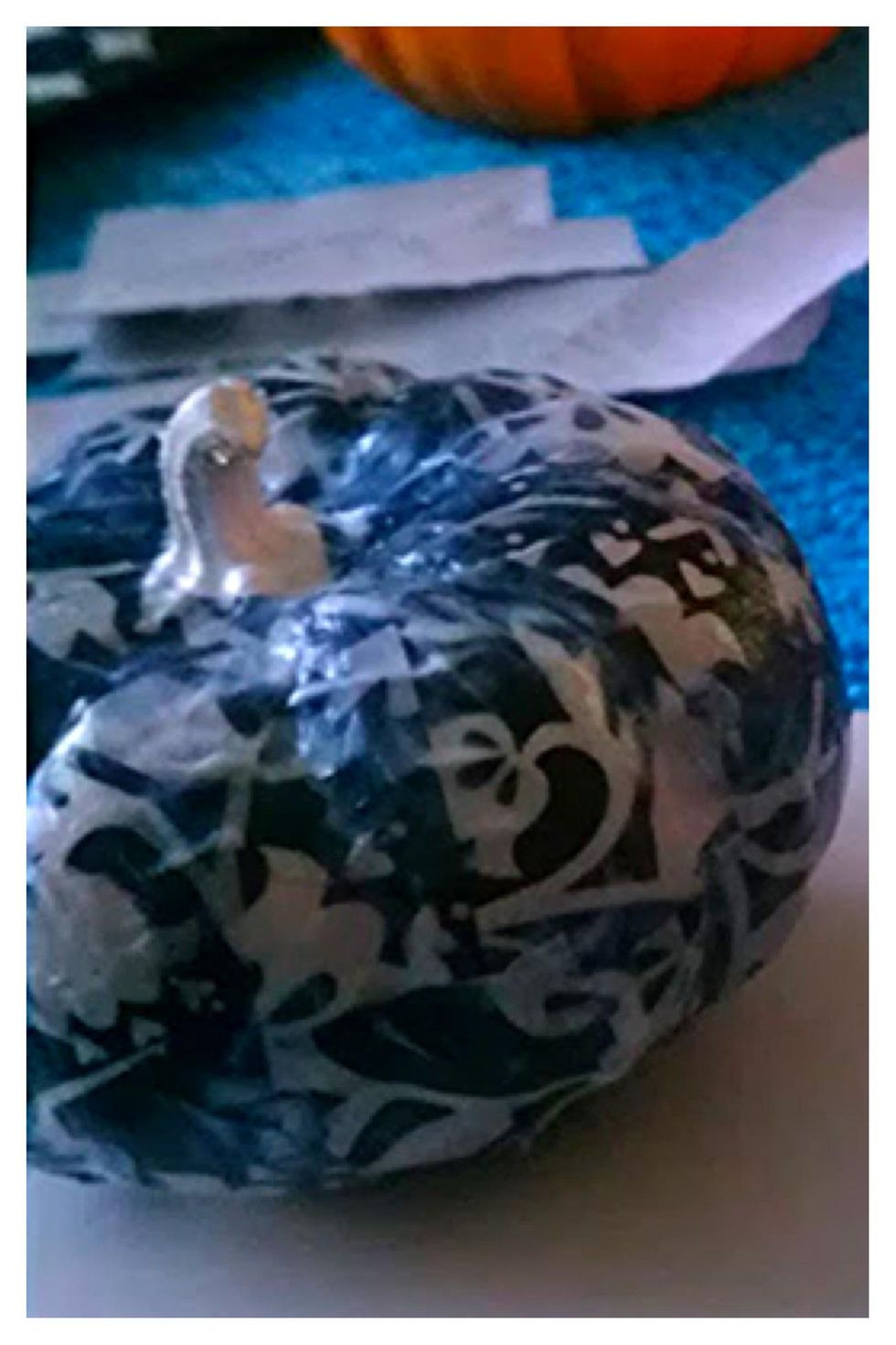 Cut tissue paper into small strips. Starting at the bottom, apply a layer of Mod Podge to the pumpkin, then lay the tissue. Apply another layer on top of the tissue.