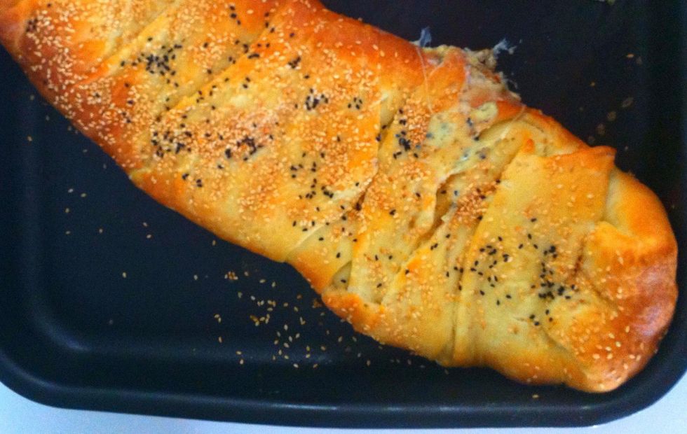 Sprinkle with seasame seeds and blackseed. Bake in oven at 350F for 35-40minutes in center rack.