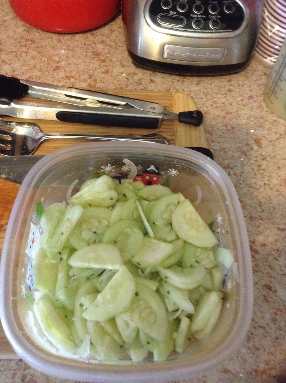 Place cucumbers and onion in plastic or glass container (non-reactive). Add 1TB thinly sliced chives.