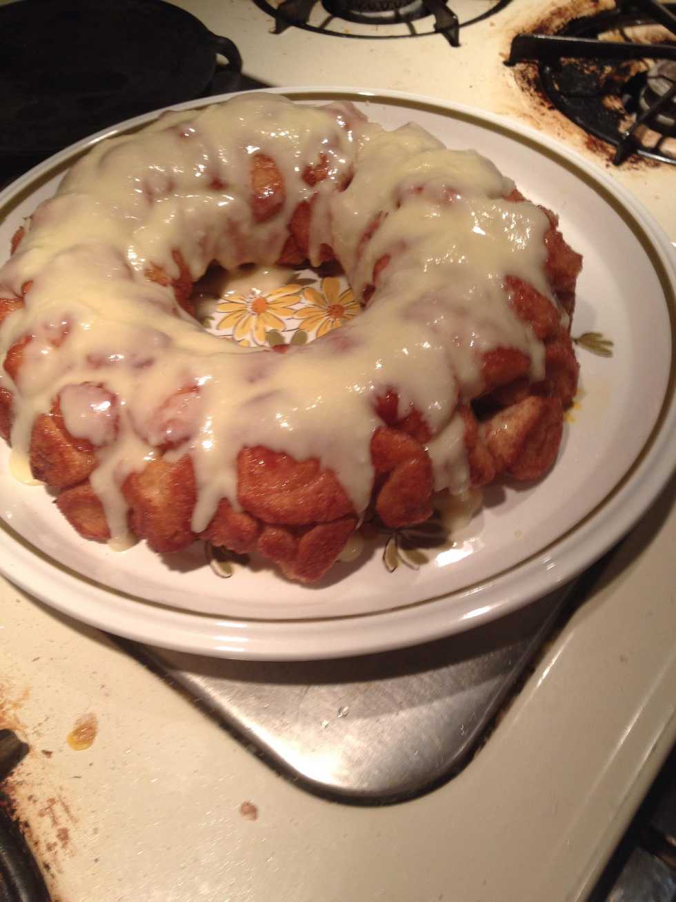 Here is my done monkey bread put on a plate upside down then kinda shake it it should come out clean if not it's ok just piece it back together