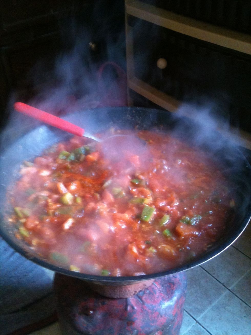 After cut the tomatos and the other things put them on fire with a half glass of huil and mixe all thing with spoon