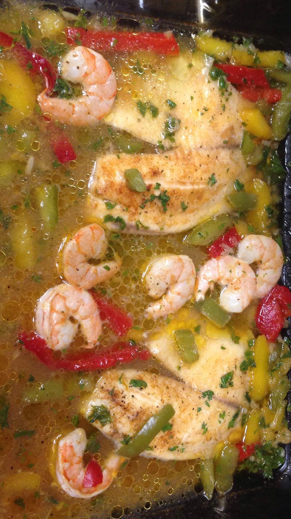 Preheat your oven to 400* F. Thaw and clean your shrimp and fish