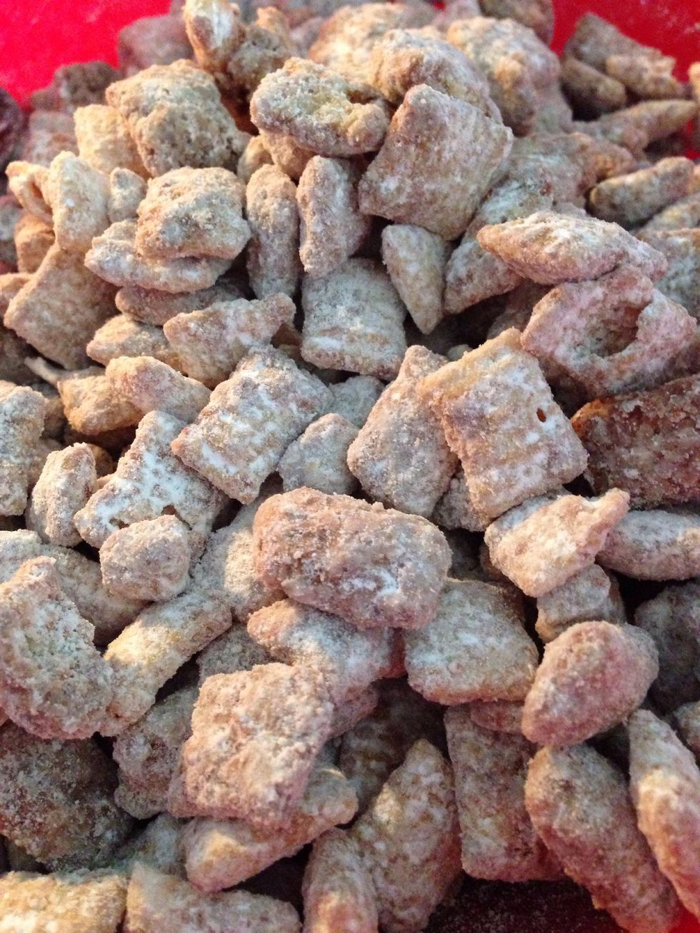 Microwave peanut butter, chocolate chips, and butter for 1 minute. Then stir in the vanilla.Pour over your favorite chex mix and gently fold.Sprinkle the powdered sugar and fold several times.