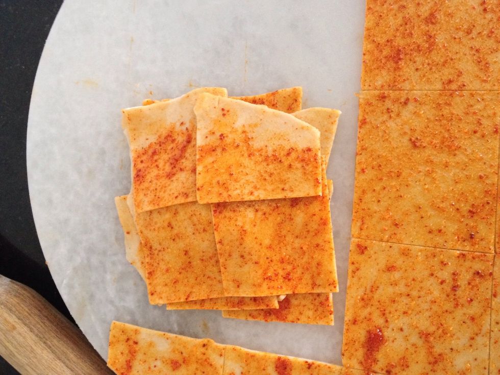 Then using a sharp knife cut the rolled dough in squares as shown. The squares should be like 1.5 inchs in size .