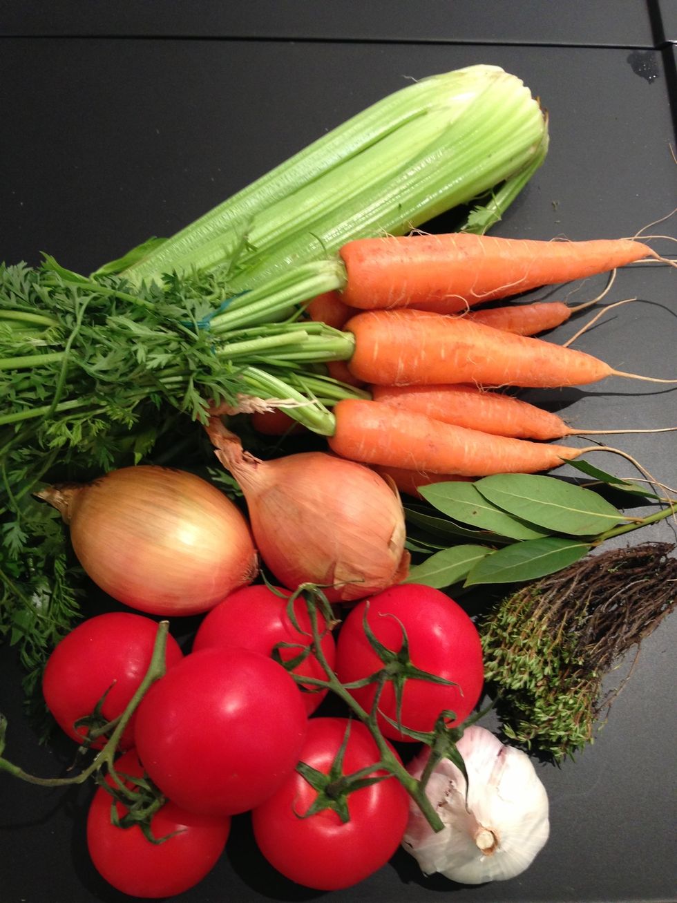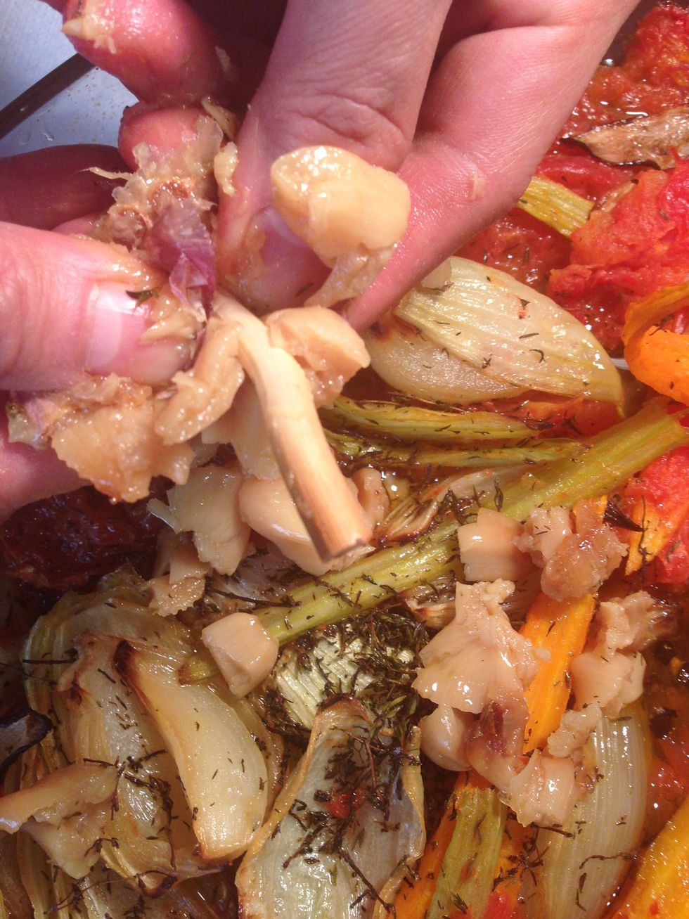 Cut the garlic head in half and squeeze out the creamy inside. Divas the bay leaves and the branches of thyme.. Leaving the small leaves