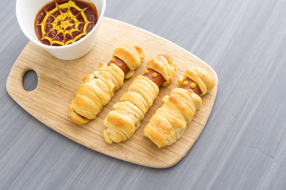 To create a spooky dip for your hot dogs, place ketchup in a bowl and draw two small circles of mustard on top w/ a mustard dot in center. Using a toothpick, draw lines from the center to bowl's edge.
